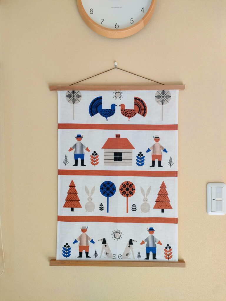 フレームに入れて飾ろうかなとも思ったのですが、ガラスやアクリルのフィルムを通さずに、ダイレクトに布の質感を味わえるので温かみを感じられてとってもお気に入り。