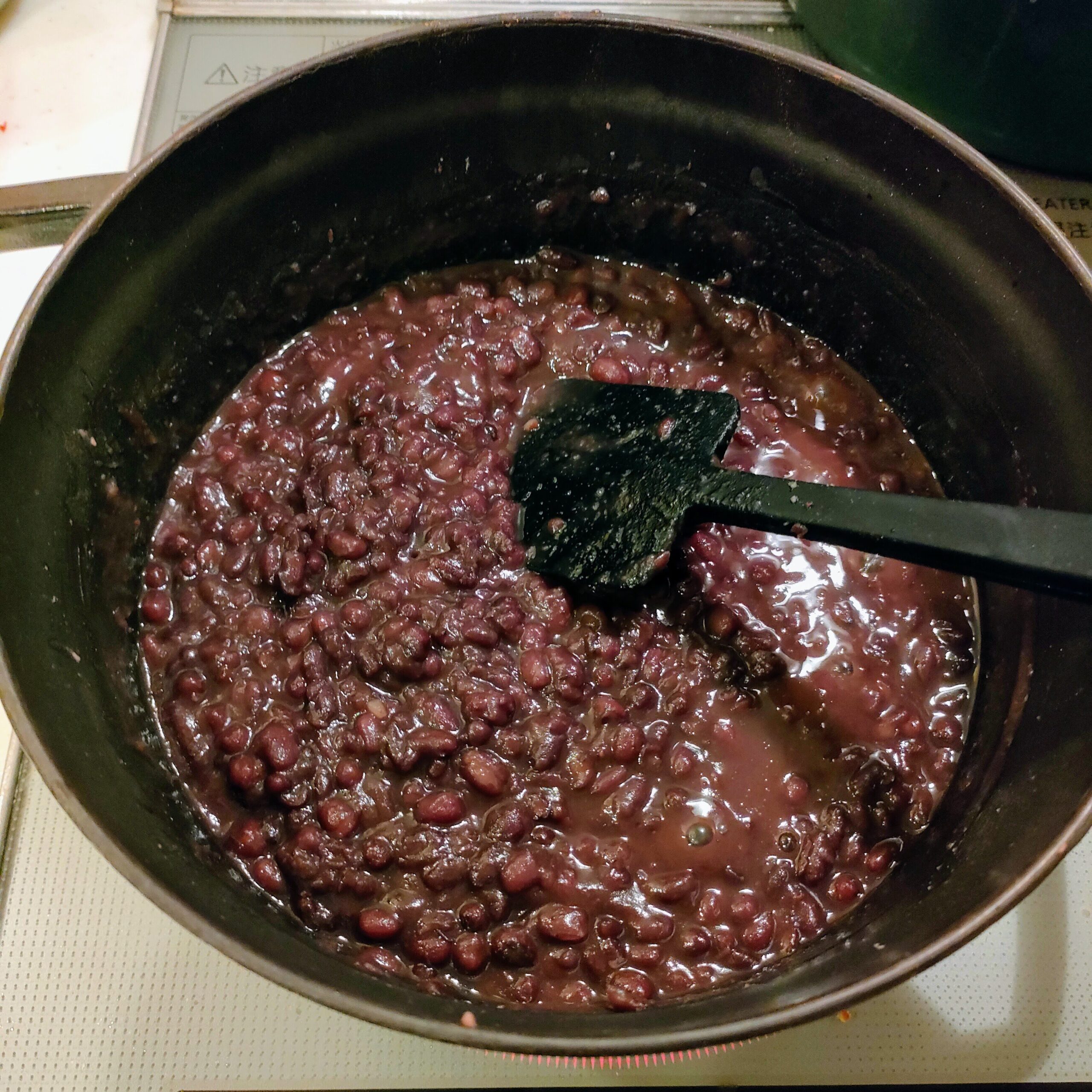 - 鍋にあんこと水を入れて溶かし、中火にかける。