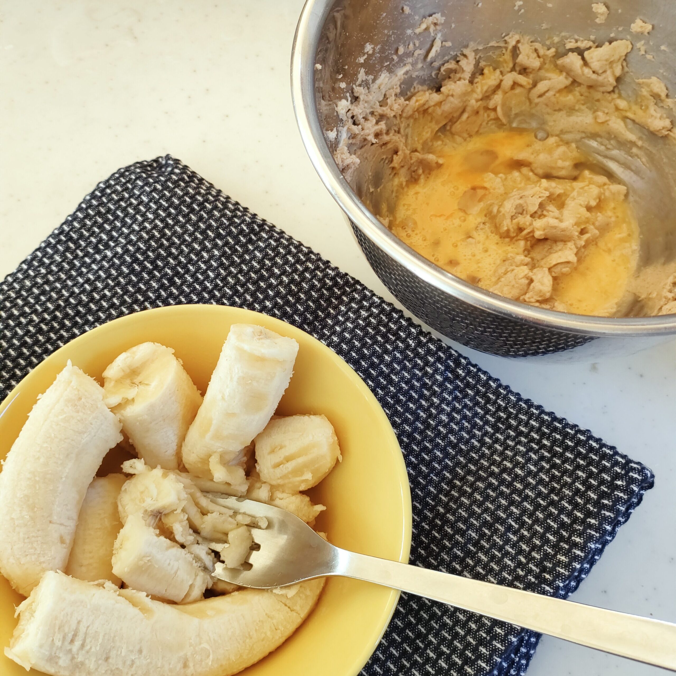 ③ ②のボウルにつぶしたバナナを加え、泡立て器でざっくりと混ぜる。