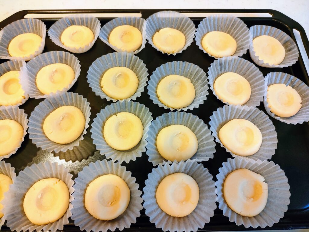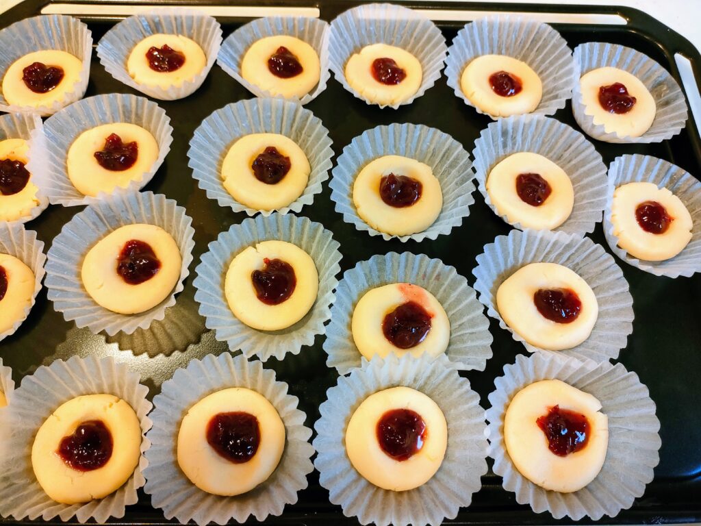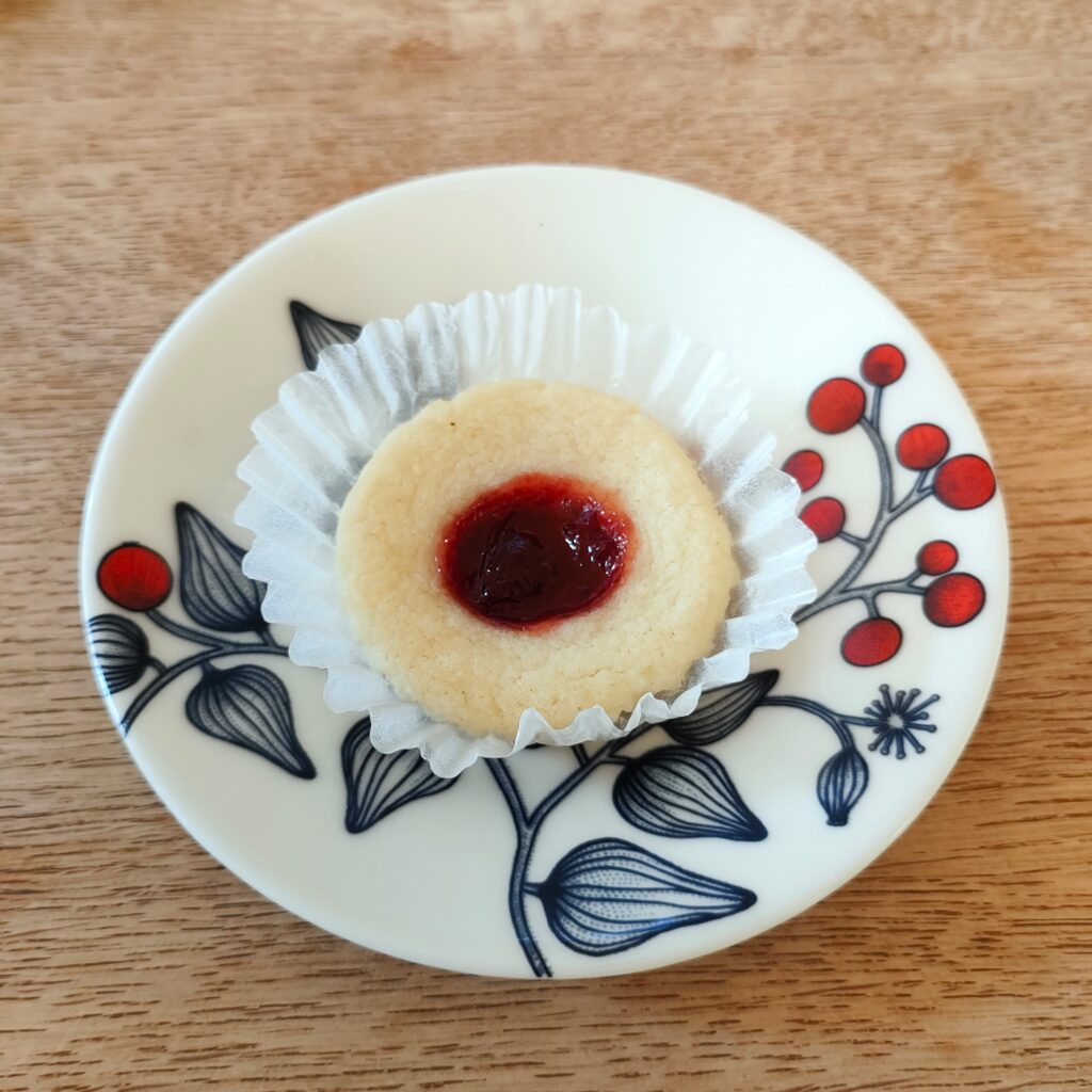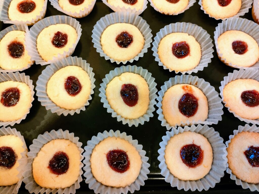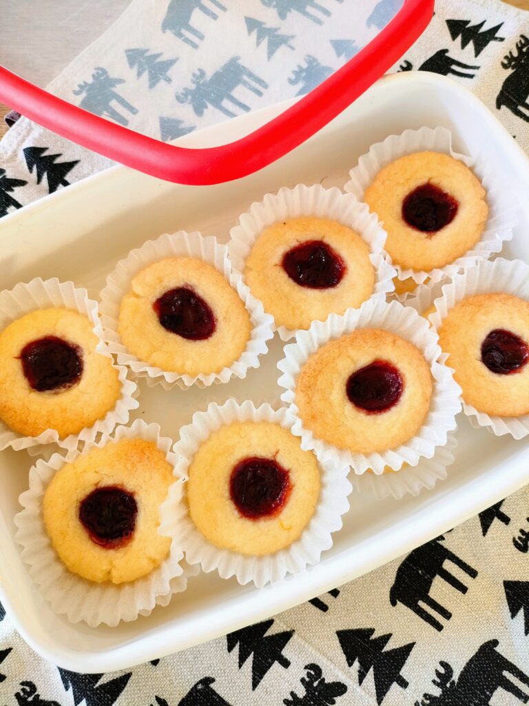 丸めたクッキー生地の真ん中に穴をあけて、そこにラズベリージャムを乗せて焼くのが名前の由来です。