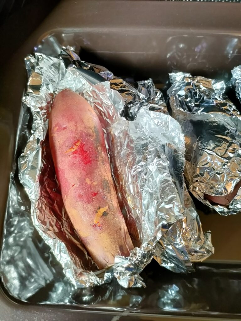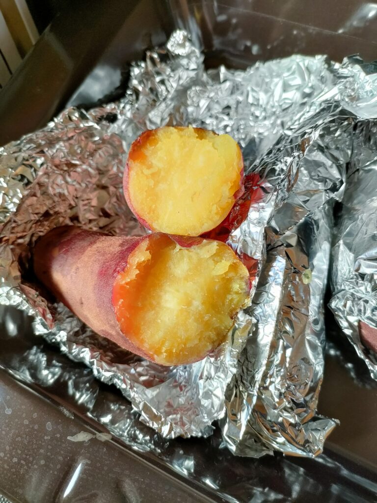 オーブンに入れるまでの工程に手間暇がかかるものは怖いけど(パンとかね。)、焼き芋なら洗って突っ込めばいいだけ。
