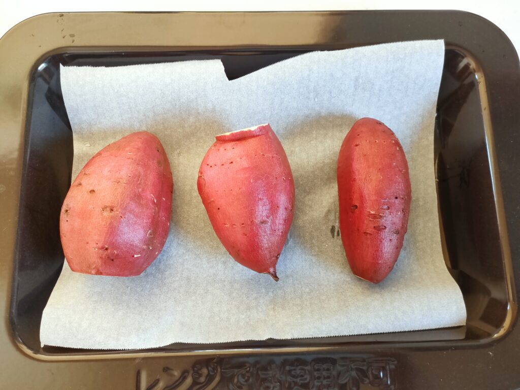 ①さつまいもは洗って水気をふき取り、フォークで数か所穴をあけて角皿に並べる。