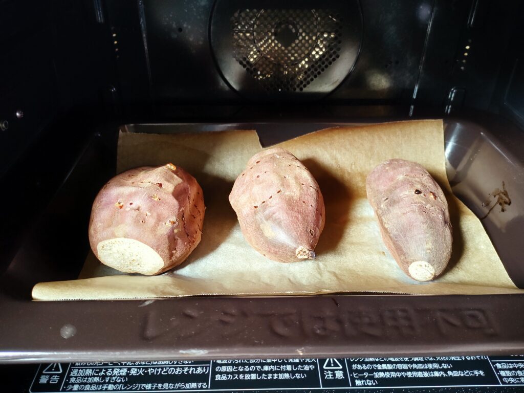オーブンに入れるまでの工程に手間暇がかかるものは怖いけど(パンとかね。)、焼き芋なら洗って突っ込めばいいだけ。